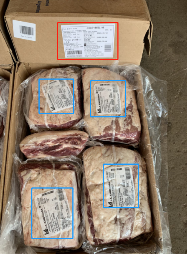 以进口肉类为例(下图):纸箱是同一个销售单元,里面装有几块单独包装的肉;按照上述要求,那么只需要在纸箱外面的标签(红框所示)上标注“注册编号”即可,而无须在里面的每块肉的包装上同时标注“注册编号”。